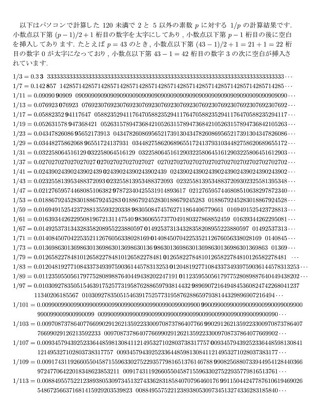 #数楽 続き。p=11,13,17,…に対する1/pの循環節が分かるところまで計算すれば、筆算の途中で余り1が出て来たら、その次の桁が0になることは明らかであることがわかるはずです。こういうことは実際に計算してみた人だけがわかる。続く