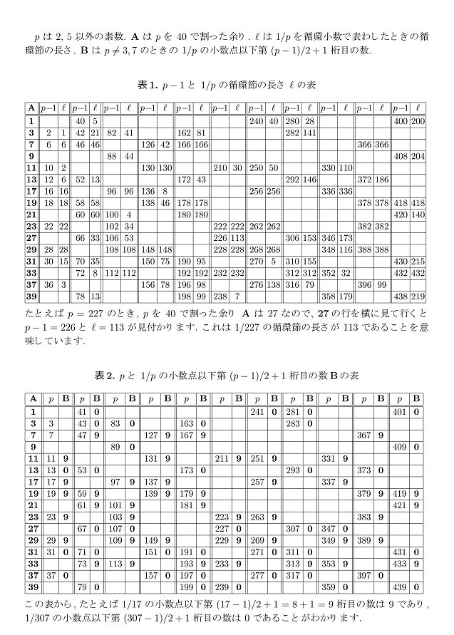 #数楽 続き。【資料2】添付画像は素数pを40で割った余りで分類して1/pの小数展開に関するデータを整理し直したものです。循環節の長さが(p-1)/2の約数になるか否かがpを40で割った余りで決まっていることがわかります。pic.twitter.com/P4DBUXWnWg