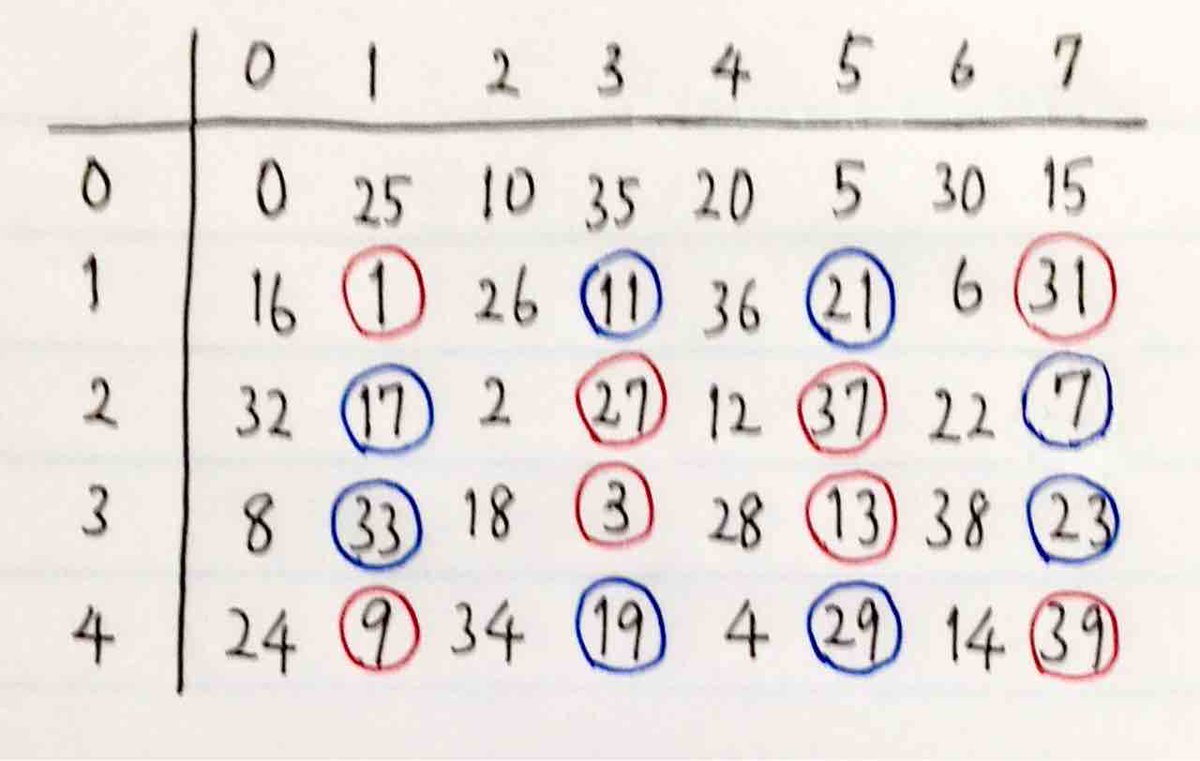 @genkuroki #数楽 pic.twitter.com/R6Uv00PHUe 添付画像は5×8の離散トーラス上を斜め45度方向に進んで0から39の数で埋め尽くすことによって作りました。左上を原点とし、縦横方向に座標も入れています。この数表はどうやって使えるのか?続く