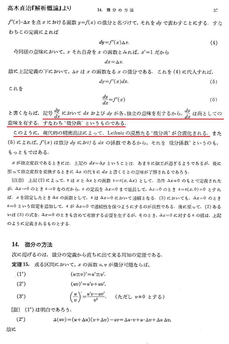 #数楽 続き。高木貞治『解析概論』p.37より【記号dy/dxにおいてdxおよびdyが各々独立の意味を有するから,dy/dxは商として意味を有する.】『解析概論』では微分の導入段階で最初から「dy/dxは商として意味を有する」となっています。pic.twitter.com/syPf8qvzR4