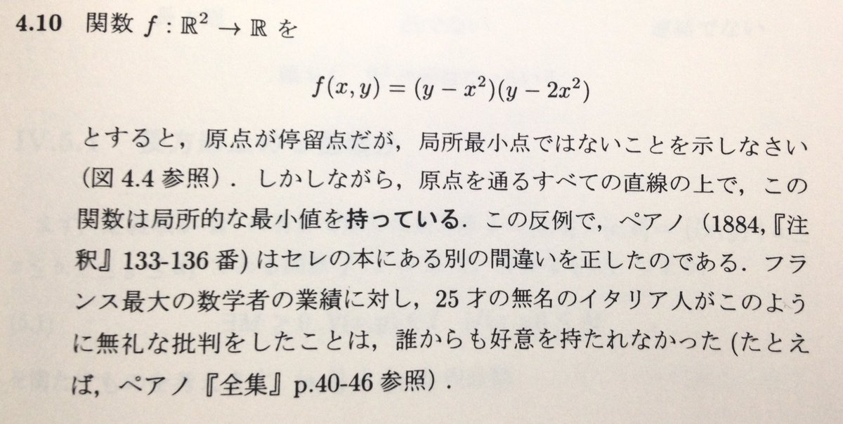 #数楽 ハイラー&ワナー『解析教程 下』 https://www.amazon.co.jp/dp/4431707514 のp.225より。ペアノさんは若いときに偉い人の数学的誤りを指摘して「誰からも好意を持たれなかった」。ペアノ、いいやつだな(笑)。pic.twitter.com/RGvwt304nq