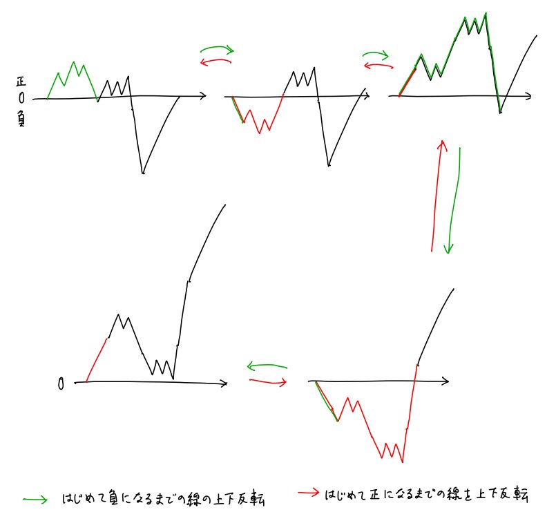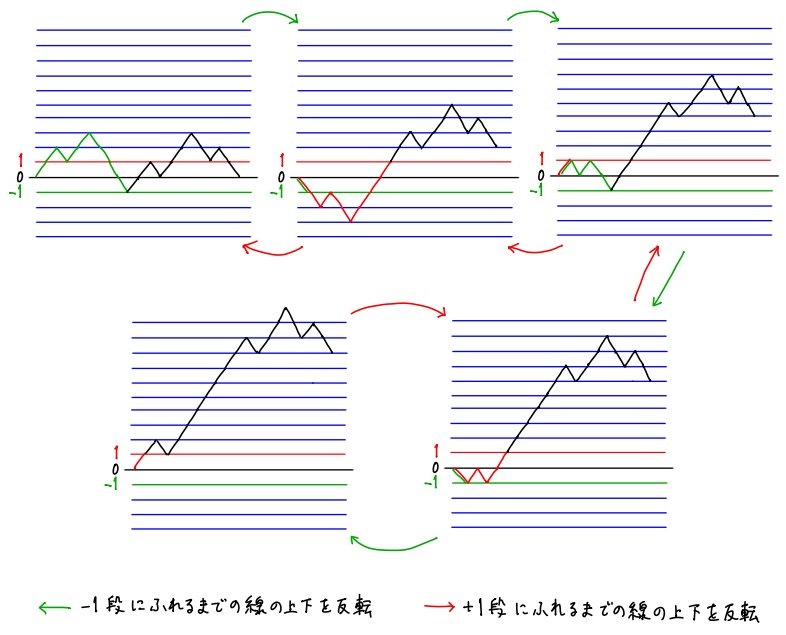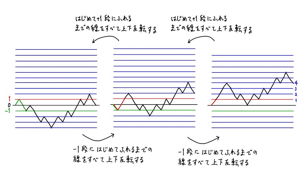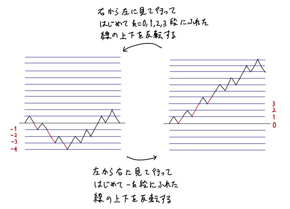 #数楽 続き。私による一対一対応の作り方は「-1段に初めて触れるまでの線の上下をすべて反転する」と「1段に初めて触れるまでの線の上下をすべて反転する」の繰り返し。反射原理を繰り返し用いている。ランダムウォークの話は様々な一対一対応が作れて面白いですね。pic.twitter.com/YK1GnZCfrg