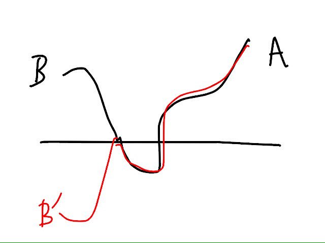 #数楽 https://twitter.com/mathedr/status/792128352505122816 …一つ前のツイートはリンク先への解説のつもり。ポイントは「AからBへの経路で直線と共通点を持つものとAからB'への経路の間に長さを保つ一対一対応があること」であり、点Cは対称点B'と違ってそのために利用できない。