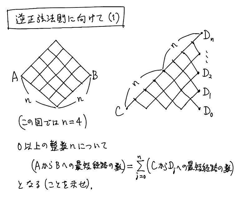 #数楽 (2)は経路の連結の話なのでわかってしまえば自明。問題は(1)の証明。私は代数計算をあまりせずに、お絵描きによる図形的直観に頼る証明で対処しました。まず「反射原理」を使い、図形内の最短経路は合同で保たれることを使う。代数計算よりも図形的直観に頼る証明の方がよいと思う。