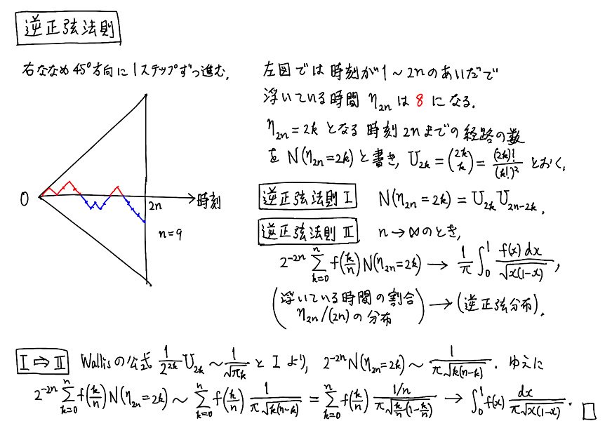 #数楽 某ノート http://www.math.tohoku.ac.jp/~kuroki/LaTeX/20160501StirlingFormula.pdf#page80 … (p.80)ではWallisの公式と逆正弦分布の関係に触れていますが、その続きのランダムウォークの逆正弦法則の話はhttp://www.math.tohoku.ac.jp/~kuroki/LaTeX/#2016-11-02 …にあります。