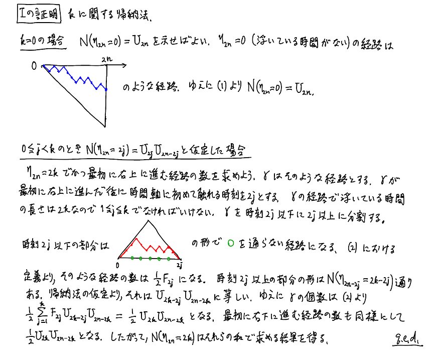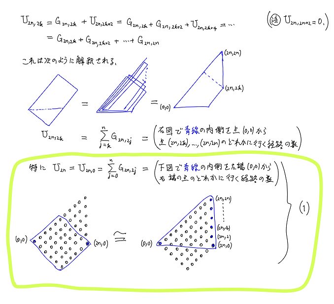 #数楽 続き。一般のランダムウォークだと少し面倒になるのですが、単純ランダムウォークの場合の逆正弦法則の証明は高校レベルの「最短経路の本数を求める問題」の発展形になっています。本質的に絵を描きながら経路の一対一対応を作って行くだけで証明できる。