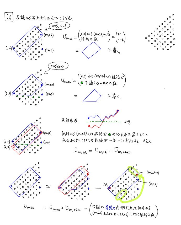 #数楽 続き。以上の単純ランダムウォークでは二項係数やカタラン数の一般化が自然に出て来たが、そのような代数的詳細によらない「お絵描き証明」になっていると良いことが結構ある。例えば二項係数やカタラン数の一般化を使ってしまうと単純でないランダムウォークに拡張できなくなる。