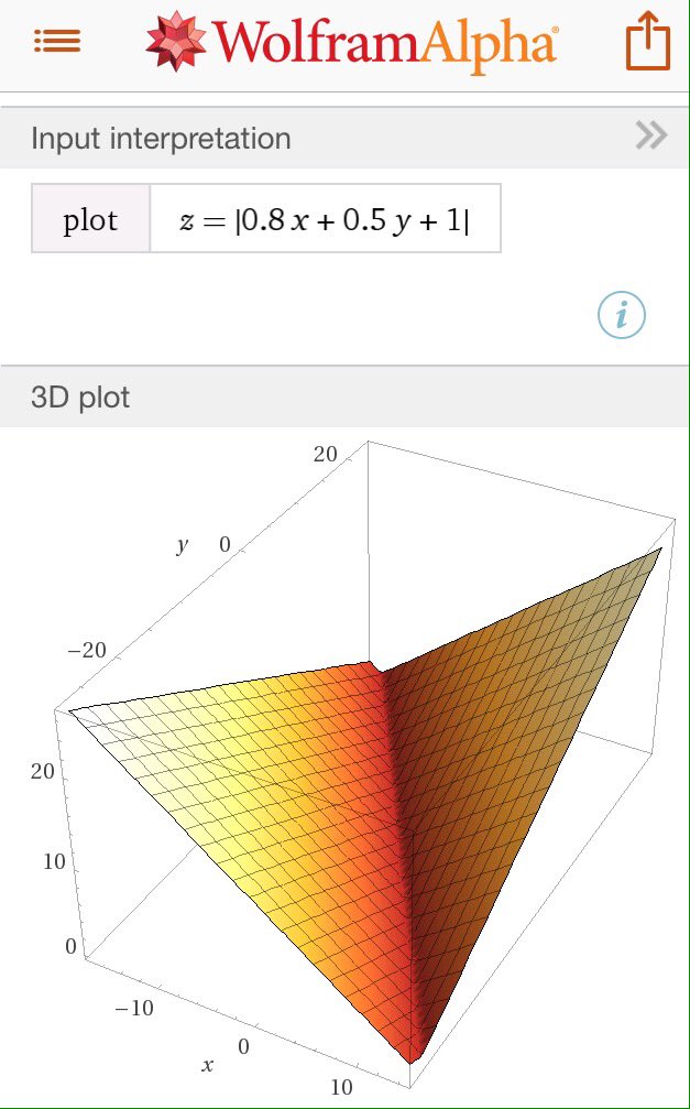 #数楽 z=|ax+by+c|のグラフの形は谷型になります(添付画像)。WolframAlphaの有料アプリにはお金を払う価値があります。適当に数学的情報を入力すると関連の情報を返してくれる。裏でMathematicaが動いています。入力が適当で良い所がいい!続くpic.twitter.com/NKiUipiwkI