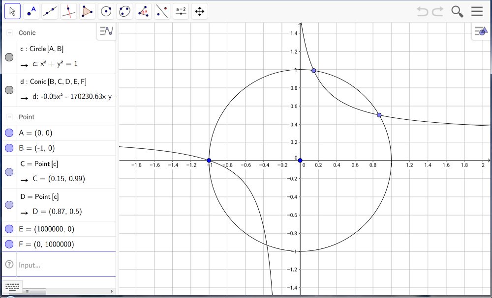 #数楽 twisted Edwards 曲線の加法公式の作図 0.01https://www.geogebra.org/m/V3DbvDqC a=0とすれば二次曲線の場合が再現されます。b=-1,a=-121665/121666に場合がEd25519で使われているEdwards曲線の実形です。pic.twitter.com/GeBICI095q