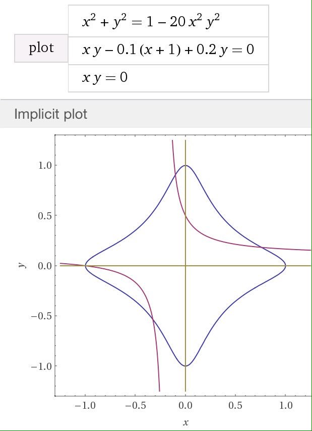 #数楽 続き。次の図が楕円曲線の群構造の特徴付けになっているという話が、私がみんなに伝えたいと思っていることの残りの半分です。円の場合の直接的一般化になっている。円の場合と楕円曲線の場合の群構造の定義の仕方が完全に同じ形!http://www.wolframalpha.com/input/?i=plot%20x^2+y^2=1-20 x^2 y^2, xy-0.1(x+1)+0.2y=0, xy=0 …pic.twitter.com/LSAK34iRkN