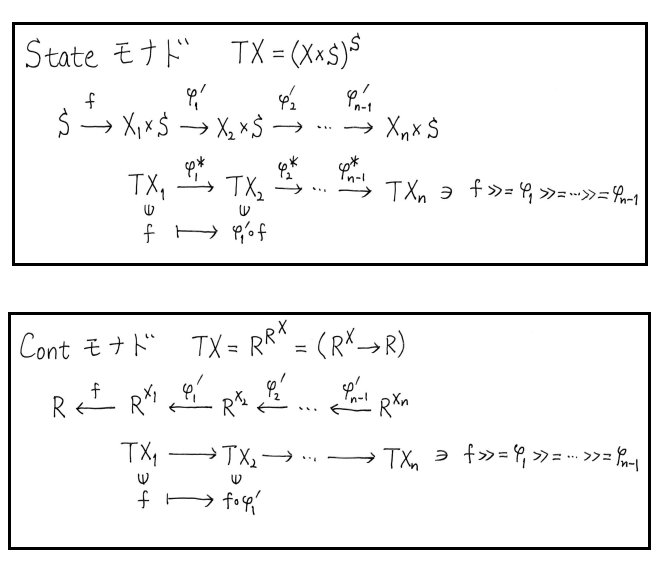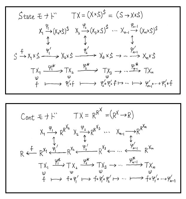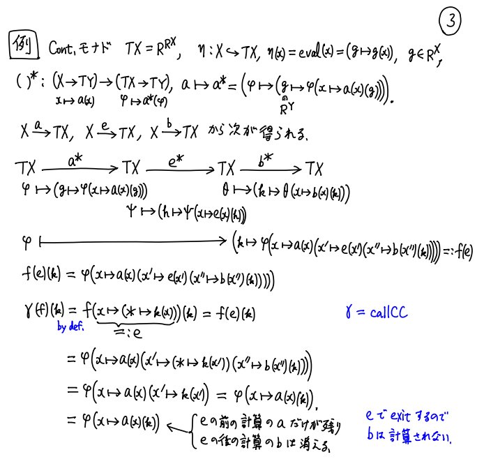 #数楽 続き。継続渡しスタイルの継続モナドTX=R^R^Xを使った表現は、計算をナマの函数α:X←Yで行うのではなく、対応する函手Tα:TX←TYと適当なTYの元から定まるTXの要素(計算を実行する函数になる)で行うと考えることによって得られます。矢線の向きに注意。