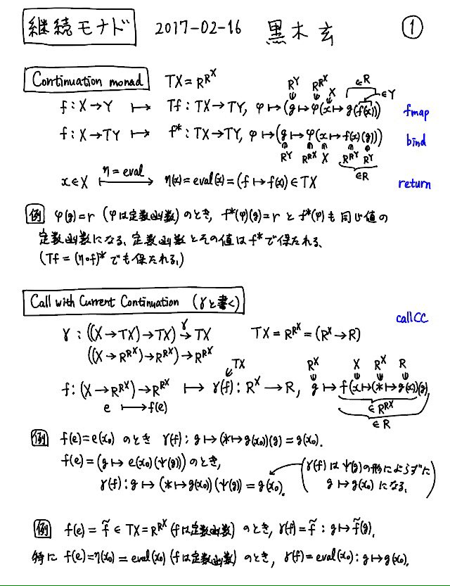 #数楽 チョー専門外のモナドの話の続き。継続モナドの定義は自己随伴な反変函手X↦R^Xを二回合成したものであることは数学的に自明な話なのですが、「継続モナドと継続渡しスタイルの関係はどうなっているんだ?」という疑問に答えようとしなければこの雑談の価値は小さくなります。