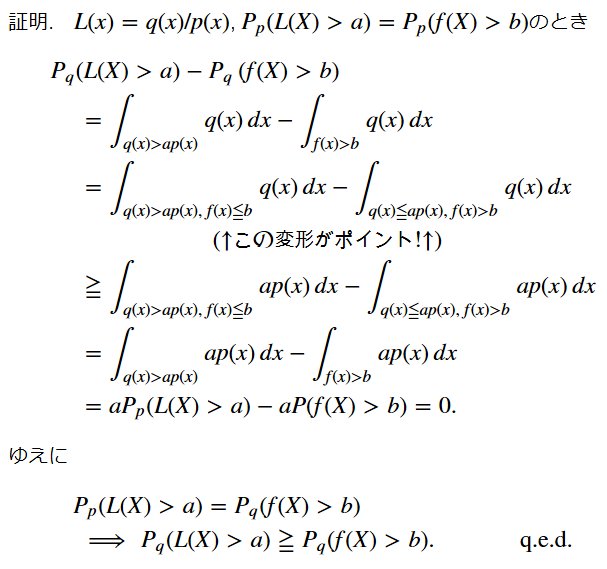 #数楽 続き。定理:L(X)=q(X)/p(X)による検定は最強力である。証明は極めて容易なので、ある程度数学に慣れた人なら、以下の説明を見ない方が証明を書き下し易いだろう。証明:P_p(q(X)/p(X)>a)=P_p(f(X)>b)と仮定する。続く