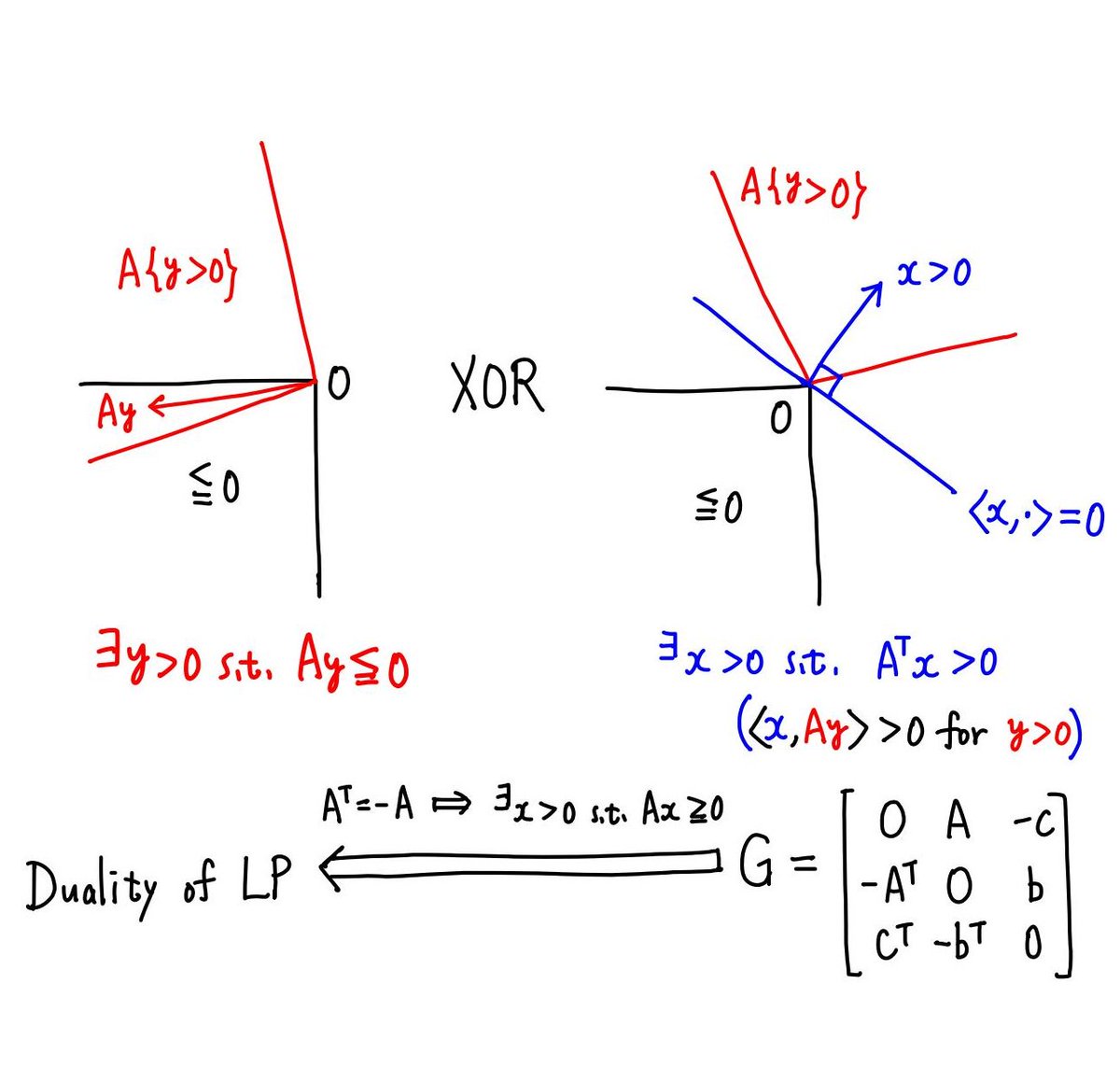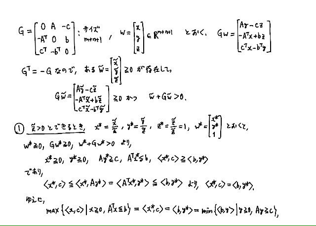 続き。そして、G=[ 0 A -c][-A^T 0 b][ c^T -b^T 0]に上の系を適用すると(P) min{〈x,c〉|x≧0,A^T x≦b}(D) max{〈b,y〉|y≧0,Ay≧c}の双対性が得られます。