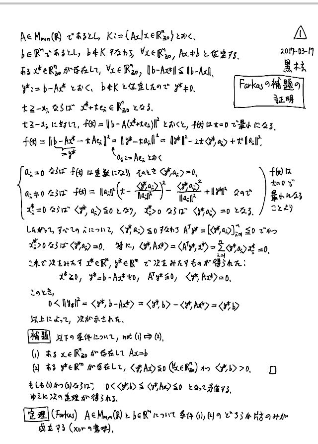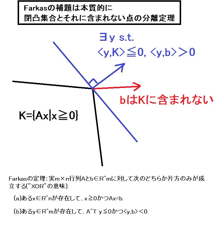 Farkasの補題は本質的に閉凸集合とそれに含まれない点の分離定理(の易しいバージョン)です。だから証明の仕方がものすごくたくさんある。"Yet Another Proof of Farkas's Lemma" な世界になっていることがググると確認できる。