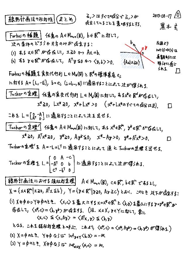 以上の話題もまた完全に専門外なのですが、「双対性はより大きな世界を別の見方をすることによって出て来ることが多い」というパターンにはまっていて分かりやすいと思う。以上の議論では、m+n+1次の大きな交代行列から、線形計画法の双対性が分かりやすく出て来ている。