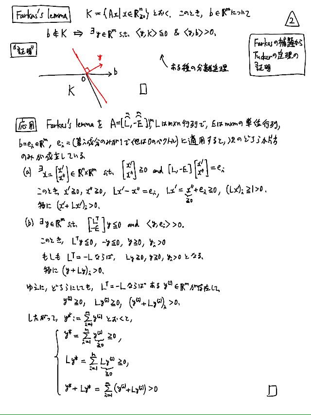 Tucker(1950)定理3:任意の実m×n行列Aに対して、あるx∈R^mとy∈R^nが存在して、x≧0, A^T x≧0y≧0, Ay≦0x-Ay>0, A^T x+y>0.ここで、≧,>はそれぞれすべての成分で≧,>が成立していることを意味する。続く
