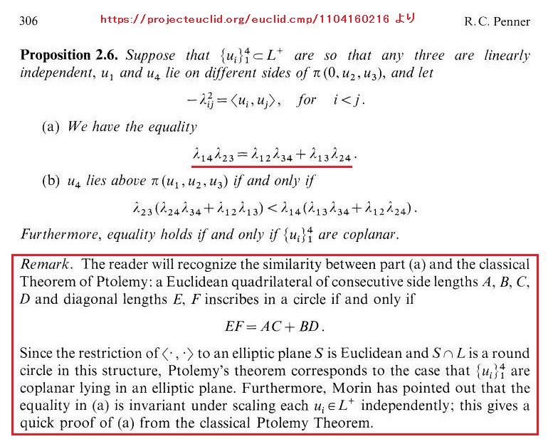 #数楽 続き。これがPennerさんの論文(1987)のProp.2.6(a)のトレミー公式です。以上で採用したミンコフスキー空間の計量(内積)の符号が論文とは逆転していることには注意して下さい。平面幾何のトレミーの定理を知っていれば、高々大学1年レベルの話に過ぎません。続く