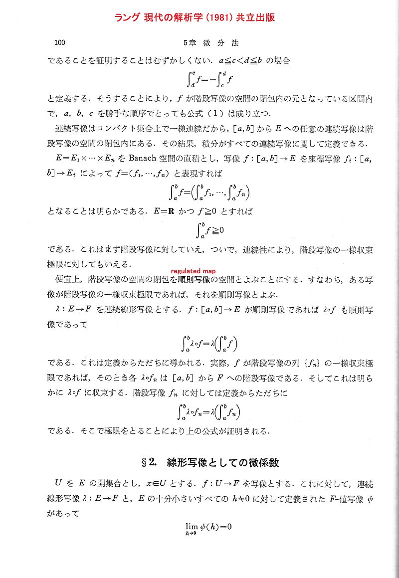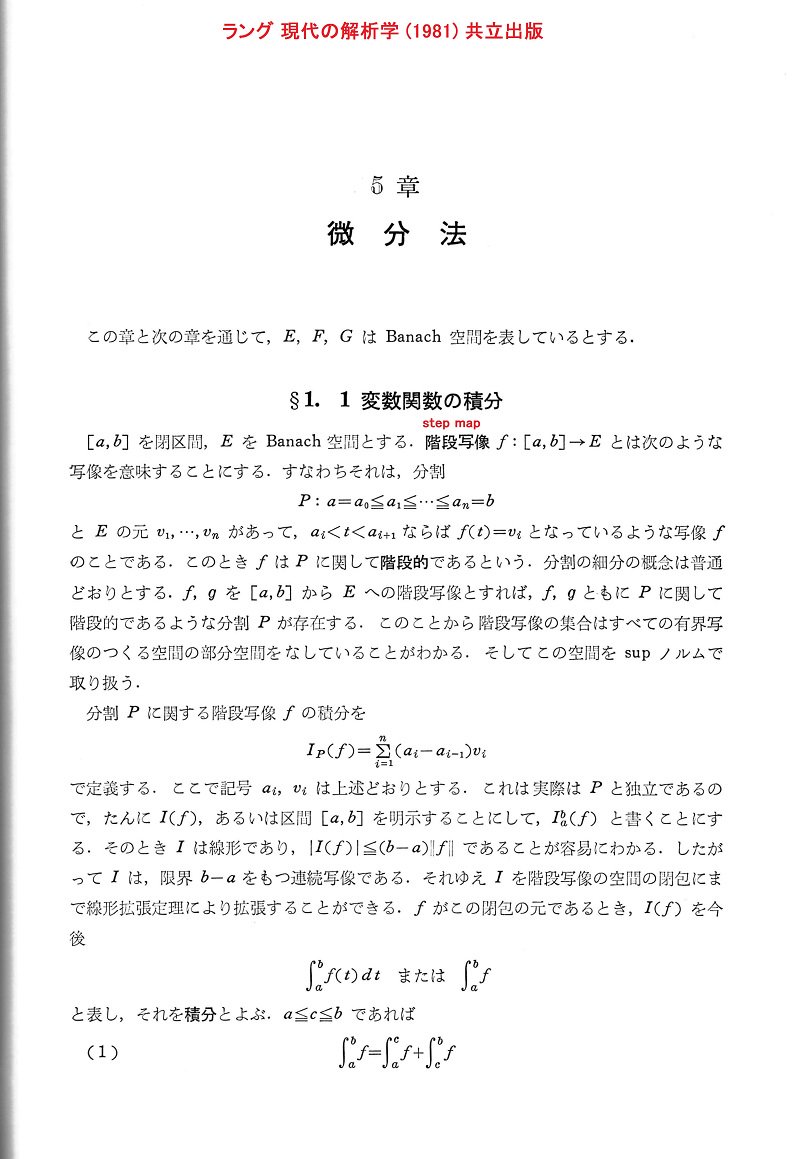 #数楽 資料追加。『ラング 現代の解析学』(共立出版1981)では微分法の最初の節が「1変数関数の積分」の構成です。階段函数の空間のsupノルムに関する閉包上に積分を定義するという間に合わせの方法で先に進むスタイル。資料1/2pic.twitter.com/1Ruars88AG