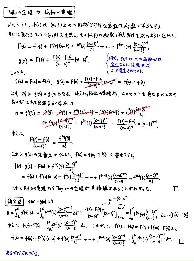 #数楽 Taylorの定理の証明をCauchyの平均値の定理を経由せずに直接Rolleの定理に帰着する方法は添付画像の通りです。英語でググるとそれなりに知られている方法のようです。pic.twitter.com/txB3uEIPqK