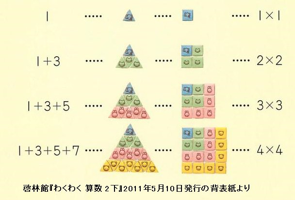#算数 おまけ。添付画像は啓林館の2011年発行の算数教科書小2下の背表紙より。1+3+5=3^2などの図示です。数学好きの人はこのような図を子供に見せることを歓迎すると思います。続くpic.twitter.com/9V9LAtQffM
