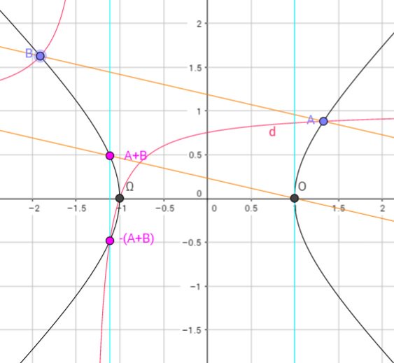 #数楽 →楕円の点Oでの接線→点A+Bを通るそれに平行な直線→それと楕円のもうひとつの交点が-(A+B)の定義→3点Ω,A,Bを通り、漸近線が「点Oでの接線に平行な直線」と「直線OΩに平行な直線」になる双曲線を描く→それと楕円の4つ目の交点が-(A+B)に一致する。証明せよ!