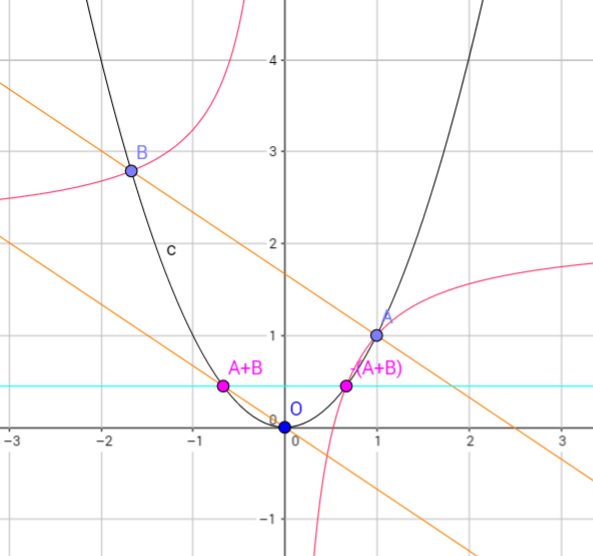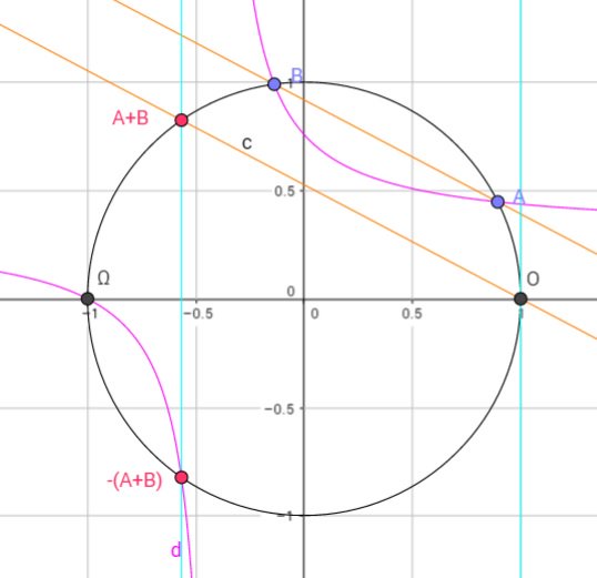#数楽 円の群構造。円上の点Oを固定。円上の点A,Bに対して直線ABと平行な点Oを通る直線と円の他の交点がA+B。Ω+Ω=O。A,B,-(A+B)は点Oの接線と直線OΩに平行な漸近線を持つ双曲線でΩを通るものとの他の3交点。https://www.geogebra.org/m/xbrMSVt5